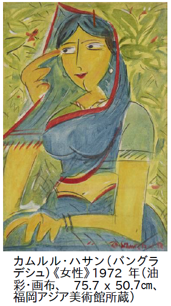 《女性》は、緑の木々を背景にした愛らしい仕草の女性が画面をはみださんばかりに生き生きと描かれた油彩画。その目は、ロイの《子鹿》のような大きなアーモンド型です。豊かな色彩と流れるような線描で人や生き物を溌溂と描くことを得意としたハサンは、活動家としての人柄とともに、ベンガル民俗芸術に立脚した素朴でデザイン性に富む作風を築き、多くの人に愛され続けています。